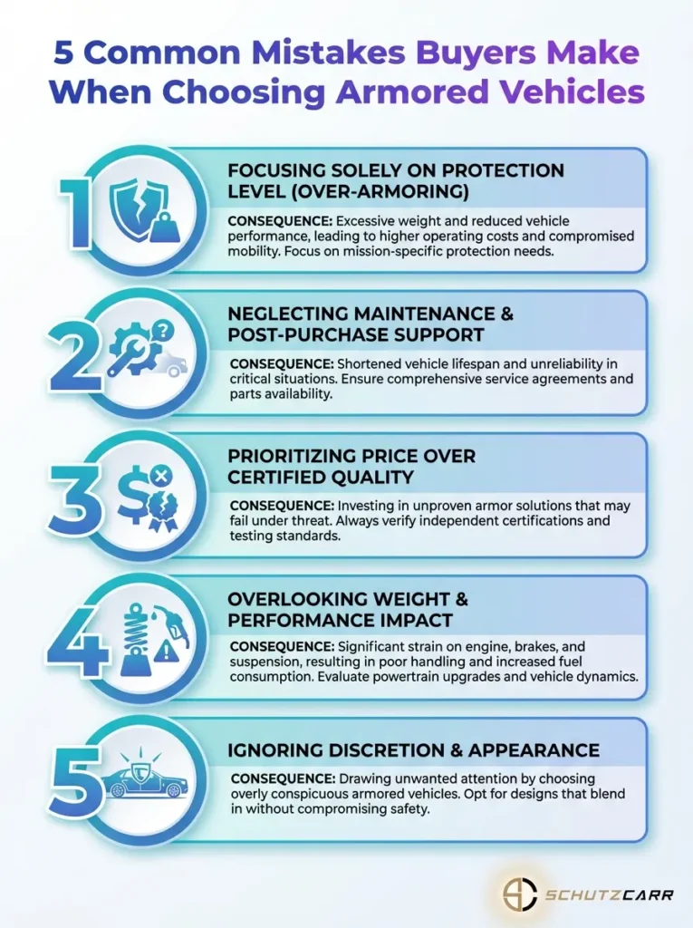 A concise visual guide outlining the top five errors buyers make when selecting armored vehicles. Use this infographic to compare options and avoid costly missteps.