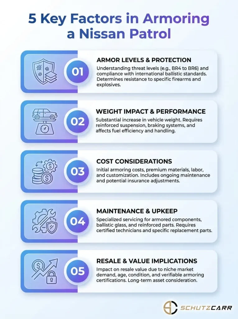 A visual guide outlining the five essential factors in armoring a Nissan Patrol. This infographic highlights safety, cost, and performance considerations.
