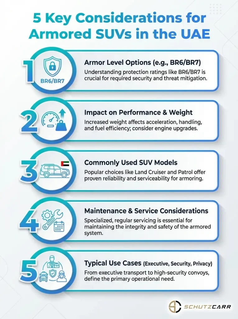 This infographic highlights the five essential considerations for armored SUVs in the UAE. It covers safety, compliance, cost, maintenance, and local regulations.