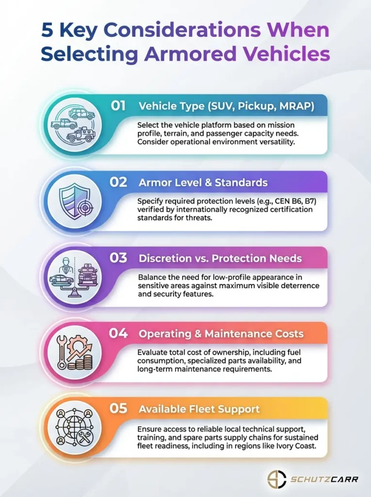 A concise visual guide to choosing armored vehicles. It highlights the five most important factors for Ivory Coast.