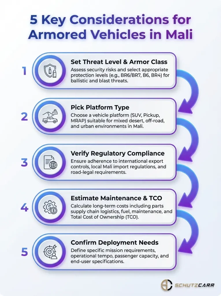 This visual guide highlights five essential considerations for armored vehicles in Mali. Use it to inform safety, deployment, and maintenance decisions.