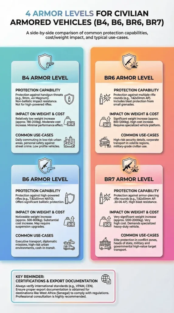 This infographic visualizes the four armor levels for civilian armored vehicles commonly used in Senegal: B4, B6, BR6, and BR7. It helps readers compare protection at a glance.