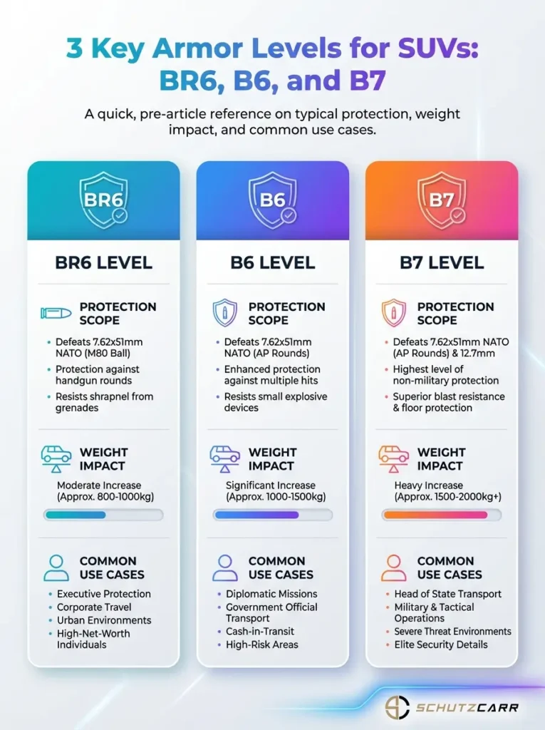 This visual compares BR6, B6, and B7 armor levels for SUVs relevant to UAE users. It highlights protection distinctions and typical civilian deployment contexts.