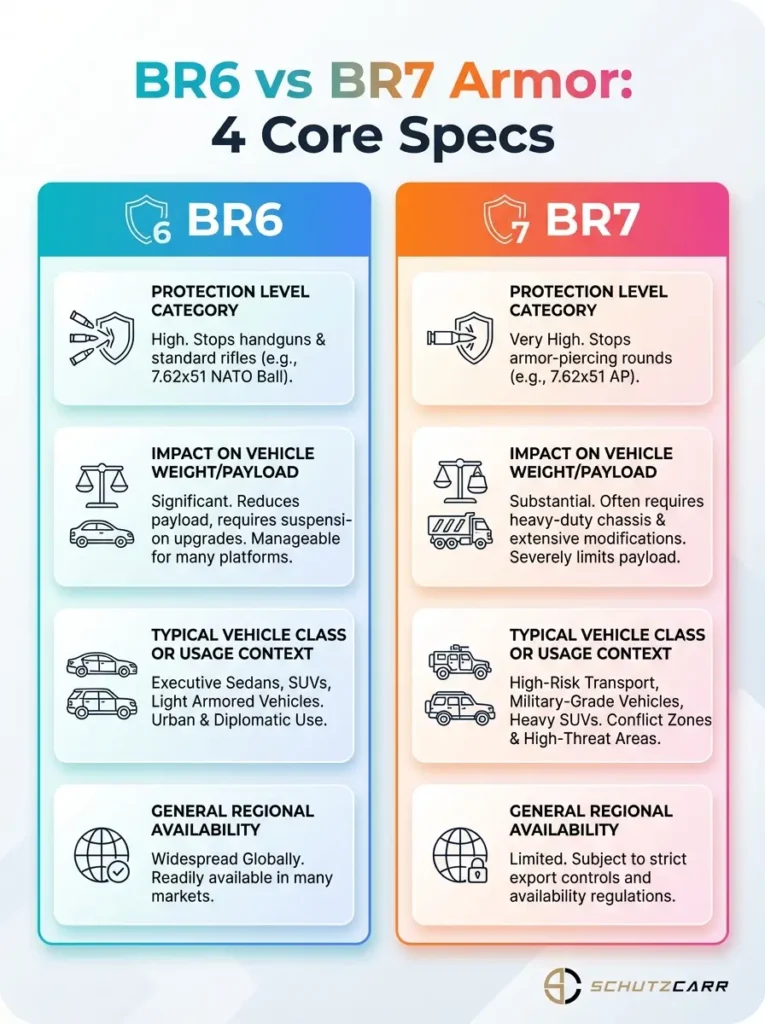 This infographic compares BR6 and BR7 armor for armored vehicles. It highlights four core specs to help evaluation.