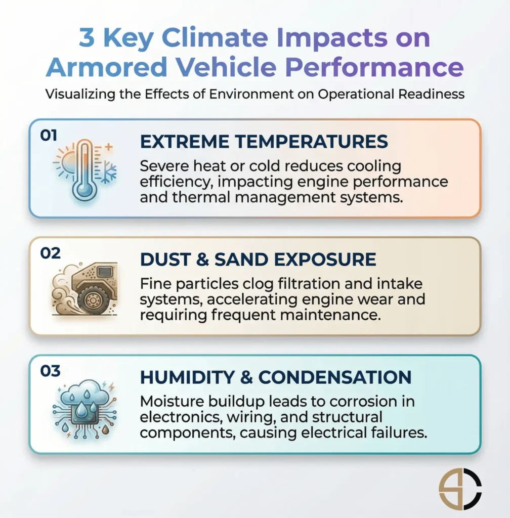 This infographic highlights three climate-related factors affecting armored vehicle performance. It explains how temperature, humidity, and dust can influence reliability and operation conditions.