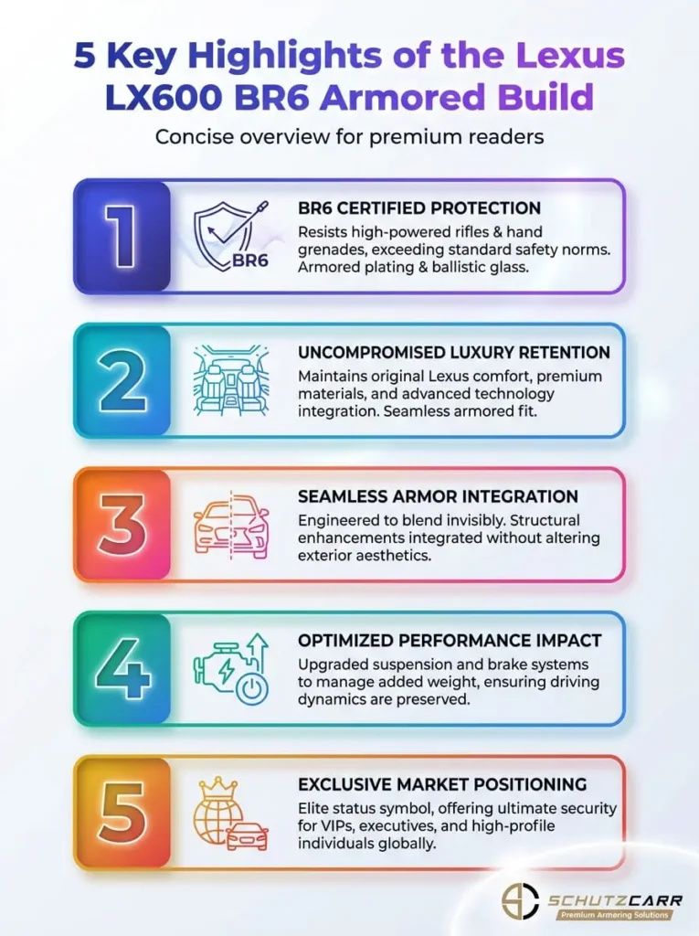 This infographic highlights the five standout features of the Lexus LX600 BR6 armored build, covering safety, armor, and performance.