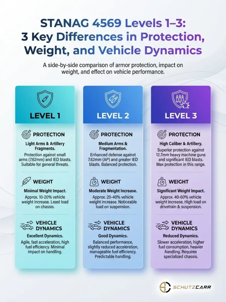 An infographic explaining STANAG 4569 Levels 1–3. It highlights three key differences in protection, weight, and vehicle dynamics.