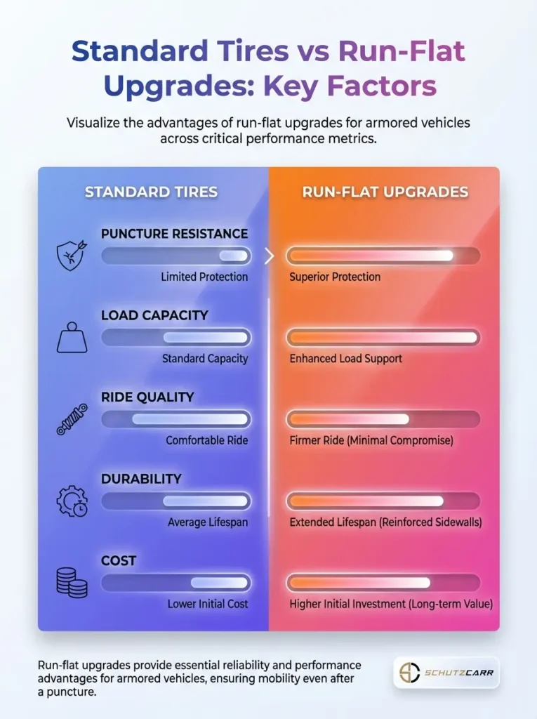 This infographic visualizes the comparison between standard tires and run-flat upgrades. It highlights key factors: cost, safety, performance, and maintenance, to help you decide the best option for your vehicle.