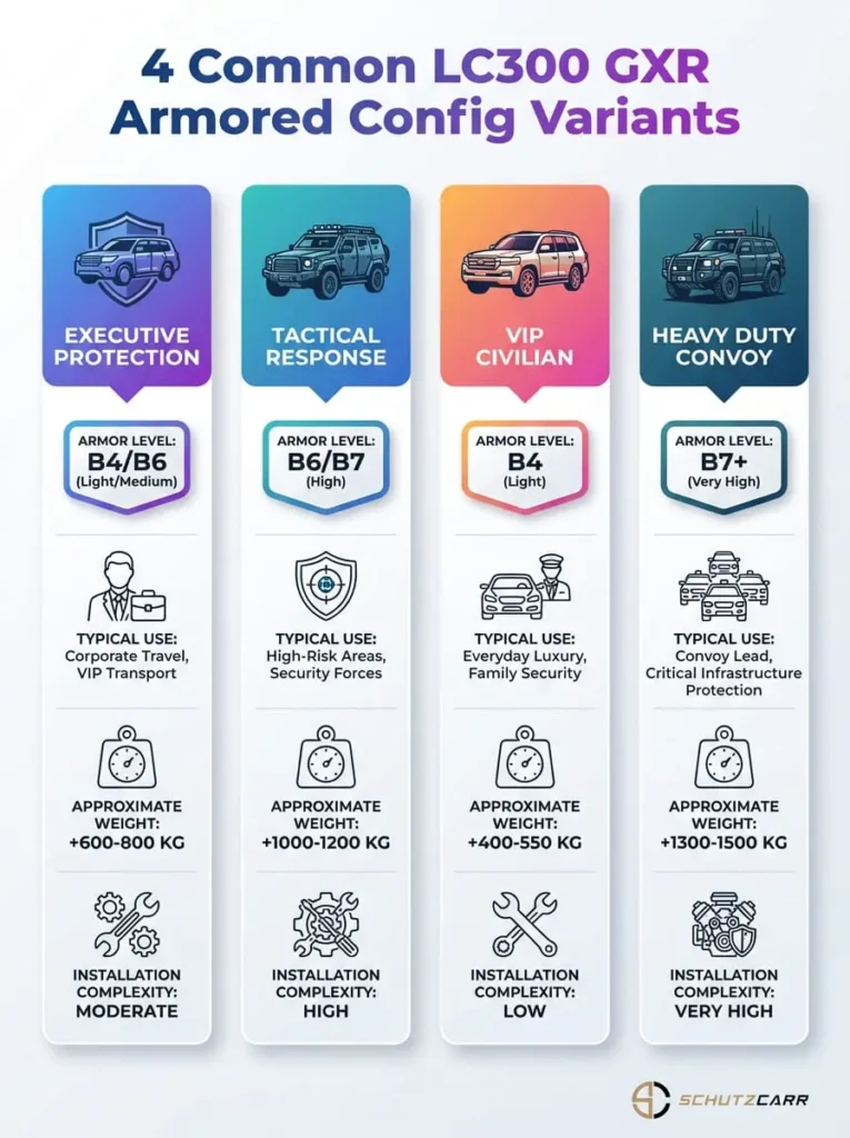 This infographic highlights the four most common Toyota Land Cruiser 300 GXR armored configurations. Use it for quick comparison of variants.