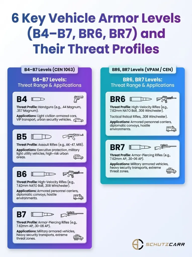 A visual guide to UL 752 ballistic standards for vehicles, highlighting the six armor levels (B4–B7, BR6, BR7) and their threat profiles.